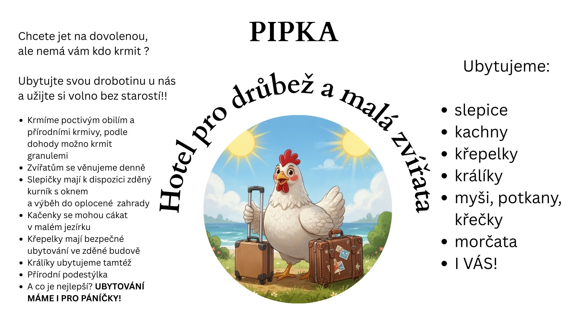 Chcete jet na dovolenou, ale nemá vám kdo krmit drůbež? Svěřte ji nám a ubytujte své miláčky v hotelu PIPKA!